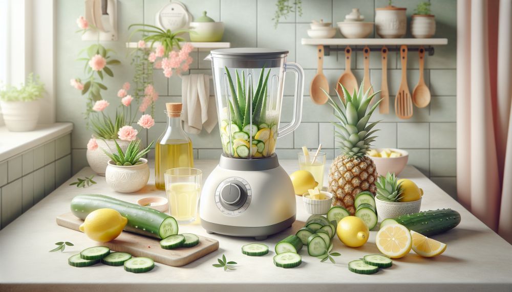 Corta cada uno de los ingredientes para que se mezclen fácilmente. Te recomendamos cortar los pepinos en rodajas y la piña en pequeños trozos. Usa 1 taza de aloe vera, 1 taza de piña, el jugo de medio limón, medio pepino en rodajas, 1 cucharadita de aceite de oliva y un vaso de agua.